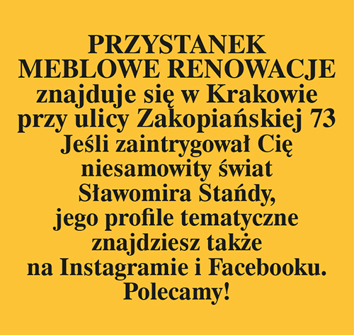 Żeby dotrzeć do Przystanku Meblowe Renowacje trzeba najpierw znać drogę, a i tak za pierwszym razem można troszkę pobłądzić. Dlatego Pan Sławek wysyła wcześniej film, który niczym kompas, wskazuje właściwy kierunek. Tak zaopiekowany podróżnik dociera z ruchliwej ulicy Zakopiańskiej do całkiem zwyczajnego podwórka, z dużym parkingiem, industrialnym klimatem, i uważnie wypatruje tych konkretnych drzwi. W chwili, gdy przekroczy ich próg, przeniesie się do innego świata.