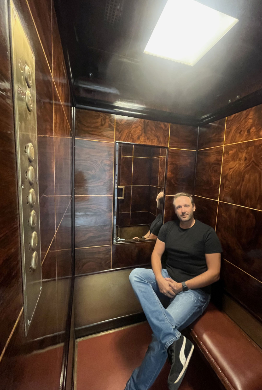 W tych latach podróż windą była synonimem luksusu i nowoczesności. Pewnie z tego powodu w każdej windzie jest lustro, żeby piękne damy mogły w nim poprawić kapelusz oraz tapicerowana ławeczka, by nawet ta krótka chwila podróży między piętrami, była komfortowa. Ściany i sufity tych wind wyłożone są fornirem, który był absolutnym symbolem elegancji. Ta cienka warstwa szlachetnego drewna, np. orzecha czy mahoniu, była powszechna w zastosowaniu w stylu art deco i dawała wyrafinowany efekt. A do tego dodajmy jeszcze mosiężne detale, kryształowe gałki i ciepłe oświetlenie, niczym w legendarnym pociągu Orient Express. No tak, jazda taką retro windą, robi wrażenie.